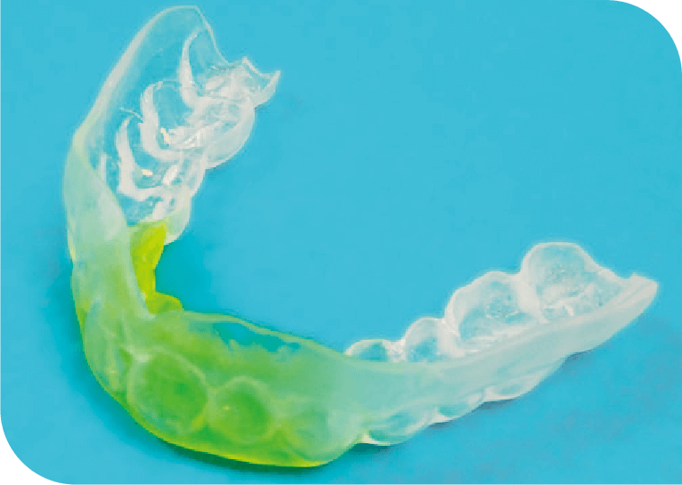 安全性を⾼めるために中間に硬めの材料を入れて3層とし、さらに歯に加わる衝撃を減らすために⻭⾯との間に1mmほどのスペースを設けているもの |