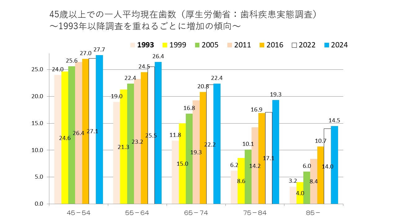 これからの日本の目標は、健康寿命の延伸です。健康寿命とは、健康で明るく元気に生活する期間、つまり寝たきりや痴呆にならない期間のことです。そのためには、歯の寿命を伸ばすことが大切。自分の歯の本数(現在歯数)は各年代で増えていきます。今後も8020運動を続けていくことによって、歯の寿命を伸ばし、健康寿命を伸ばすことが可能です。